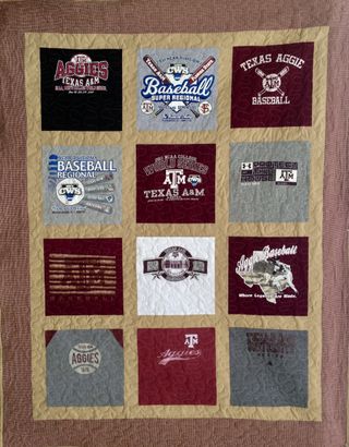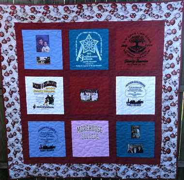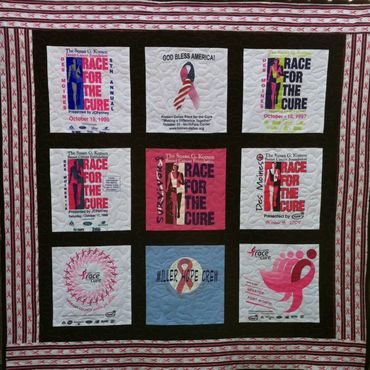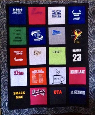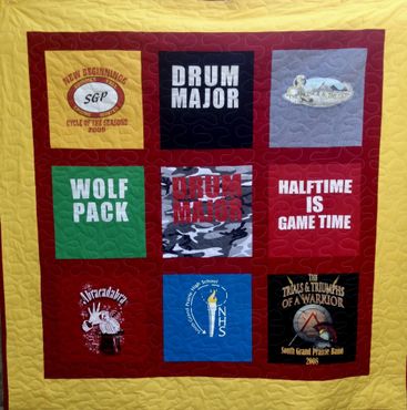 If you have a collection of T-shirts that you no longer wear, and you can't bear the thought of getting rid of them because they have great memories attached to them, then a Memory T-shirt Quilt is the perfect solution. MemoryT-shirt Quilts are made from your favorite T-shirts, sweatshirts, jerseys and more. These quilts are a beautiful keepsake that will brighten your home and allow you to relive those wonderful memories day after day. Each Quilt is custom made to your specifications. No two quilts are exactly the same.