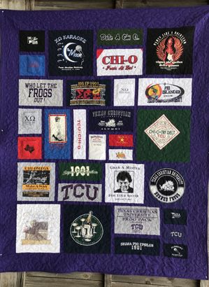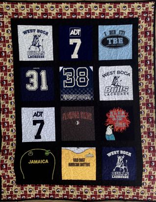 If you have a collection of T-shirts that you no longer wear, and you can't bear the thought of getting rid of them because they have great memories attached to them, then a Memory T-shirt Quilt is the perfect solution. MemoryT-shirt Quilts are made from your favorite T-shirts, sweatshirts, jerseys and more. These quilts are a beautiful keepsake that will brighten your home and allow you to relive those wonderful memories day after day. Each Quilt is custom made to your specifications. No two quilts are exactly the same.